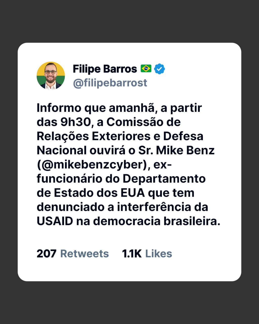 Federal Deputy Filipe Barros states that the Brazilian Congress will hear from Mike Benz, a former U.S. State Department official, who has denounced USAID interference in Brazil’s democracy.