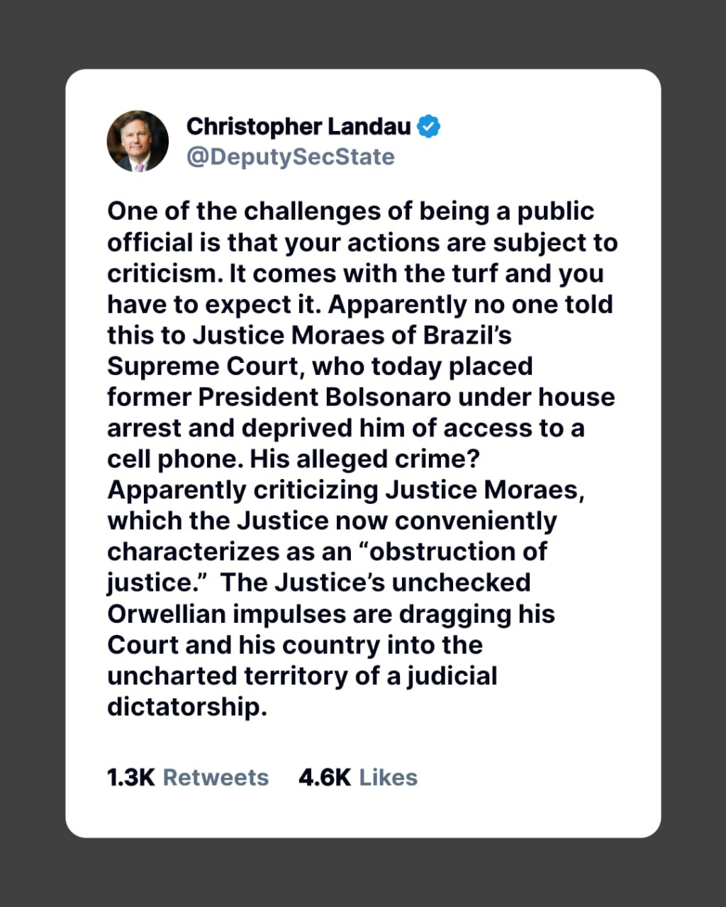 U.S. Deputy Secretary of State Christopher Landau denounces that Supreme Federal Court (STF) Justice Alexandre de Moraes placed former President Jair Bolsonaro under house arrest without conviction, following Orwellian impulses…