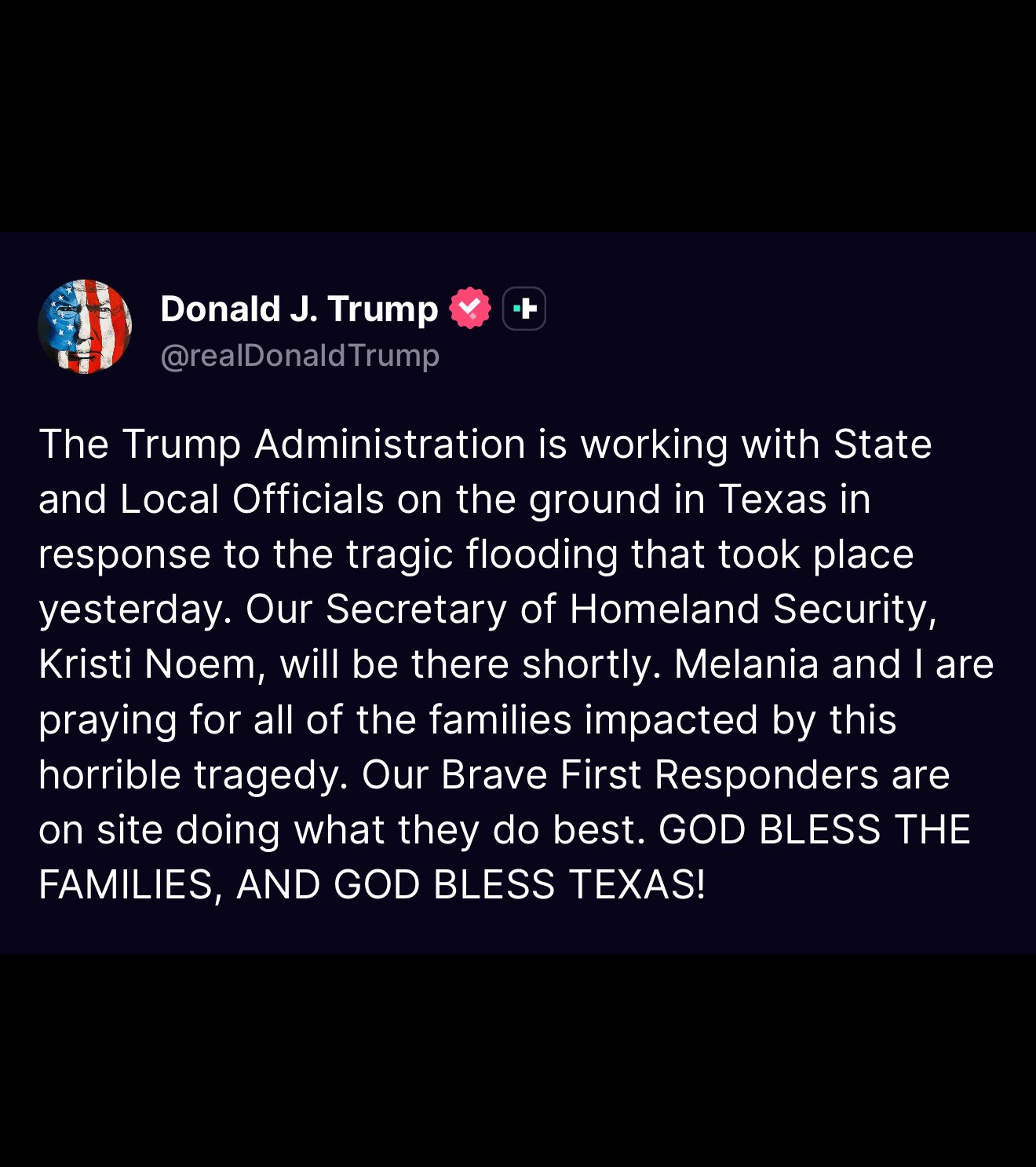 President Trump says Kristi Noem is PERSONALLY coming here to Texas Hill Country to help direct federal relief efforts amid flooding
