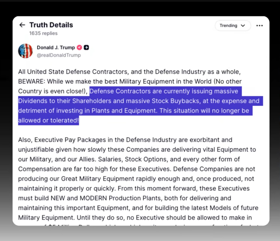 In a series of blistering posts, President Trump demanded that major defense contractors end their stock buybacks and cap their salaries.
