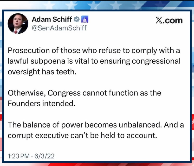 Now watch Adam Schiff dance around what he said in 2022 concerning subpoenas…