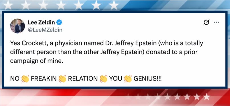 Miss High and Mighty Jasmin Crockett tries to smear Republicans who took money from Epstein - forgetting to check some details along the way…