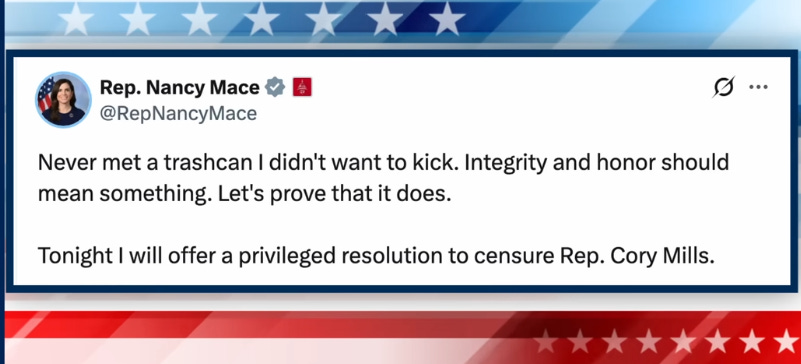 The Dems are leveraging the threat of censorship of Cory Mills, who would be removed from the Armed Services Committee if the Republicans followed through on censoring Stacy Plask and getting away with it