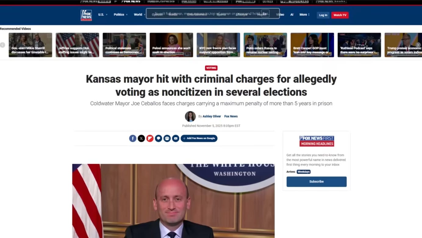 A shocking case of election fraud has emerged in Cold Water, Kansas, where Mayor Jose Ceballos has been arrested and charged with 6 felonies for illegally voting while ineligible due to his non-citizen status.